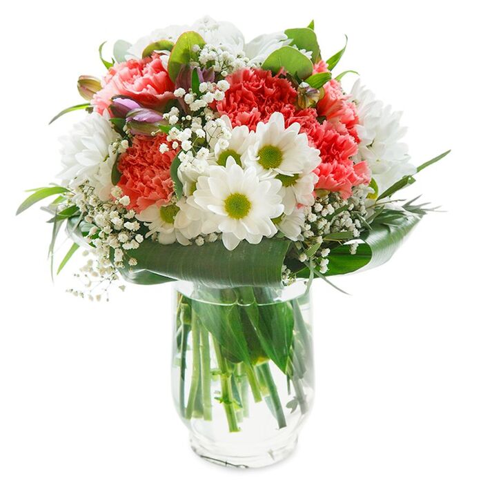 There's a gentle optimism to this bouquet, as if the humming energy of springtime in Chase Cross has been gathered and arranged with loving hands. Fluffy coral and rich red carnations, ruffled and exuberant, form the heart of the piece, sharing space with snowy white daisies whose green-yellow centres glow like a sunlit garden bed. Wisps of tiny, pure baby's breath dance between the larger blossoms, lending an innocent, almost playful spirit-much like the breezes that wander down Chase Cross's tree-lined lanes. A circle of glossy, deep green leaves cradles everything in a polished embrace, their verdant sheen enhancing the bouquet's fullness and structure. Tucked quietly to the side, shy hints of purple buds suggest future blossoms, adding an element of ongoing discovery. The arrangement is thoughtfully presented in a smart, white gift bag with elegant ribbon handles-ready to accompany heartfelt greetings or offer a bright surprise for family, friends, or neighbours celebrating life's milestones in Chase Cross. Every flower seems touched by the hands of a careful local florist, and the professional white background sets off each vibrant shade with clarity. This bouquet radiates cheer and warmth, perfect for uplifting spirits or marking cherished moments with beauty and sincerity. This artful bouquet, crafted in the heart of Chase Cross, is a joyful homage to the area's quiet strength and blossoming parks. At its centre radiate cheerful white daisies, their gold-tipped, lime-green centres framed by gracefully arching coral-pink carnations that bring both warmth and vibrancy. Between these primary blooms, delicate sprays of gypsophila create a dreamy, star-like effect, mimicking the gentle, fleeting beauty of morning mist on Bedfords Park meadows. Emerging from within the plush textures are slender buds of alstroemeria, blushed with sunset tones-hints of new beginnings and unspoken wishes. Silky eucalyptus leaves mingle with velvety deep green foliage, providing a tranquil foundation and a touch of woodland coolness that calls to mind the tree-lined avenues of Chase Cross Lane. The design is bathed in soft, diffuse light against a crisp, clean background, highlighting the thoughtful harmony and vividness of every petal and sprig. Every aspect, from the tactile caress of petals to the balanced circular shape, reflects the detailed craftsmanship and community spirit of Chase Cross floristry. Whether given in thanks, celebration, or simply to brighten a kitchen table along Havering Road, this bouquet embodies an exuberant yet peaceful charm, bringing a flourish of Chase Cross freshness into everyday life. This bouquet shines with cheerful vibrance and quiet elegance-embodying the easy freshness of an early spring day in Chase Cross. At its core, soft coral-pink carnations bloom in a lively gathering, their ruffled petals adding joyful movement and a sense of personality. Crisp white chrysanthemums and little daisies, each bearing a fresh green eye, unfold around the centre like miniature suns, evoking a sense of hope and renewal reminiscent of local gardens after a gentle rain. Interwoven among the prominent blooms, delicate threads of baby's breath create a fine, cloud-like effect, softening the arrangement's outline and infusing it with airiness. To the side, closed magenta alstroemeria buds introduce a hint of anticipation and subtle colour contrast. Encasing the vibrant core is a mix of glossy, broad green leaves and thinner, graceful strands of foliage, grounding the bouquet with a lush, organic feel. The transparent glass vase reveals immaculate stems immersed in clear water, enhancing the visual impact of pristine freshness-a hallmark of Chase Cross Flowers' bouquets. Even, bright lighting bathes the entire scene, highlighting textures and true-to-life colours. Thoughtfully crafted for special occasions like birthdays or thank yous, this bouquet would bring instant warmth and light into any home from Chase Cross to the nearby fields, its soft scent and uplifting palette inviting positivity and fond memories.